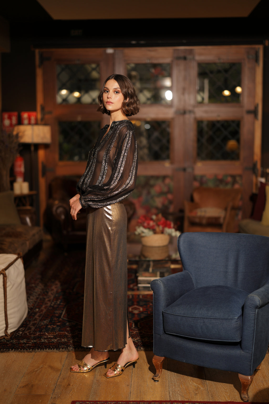 The Federica blouse is super stylish and chic. Made of delicate, airy material with contrasting lurex details. Long sleeves and slightly narrow cuffs. Flowing fit. Loose fit. Front button opening. Tunisian collar. Timeless. The Federica blouse will add a touch of glamour to your outfit!