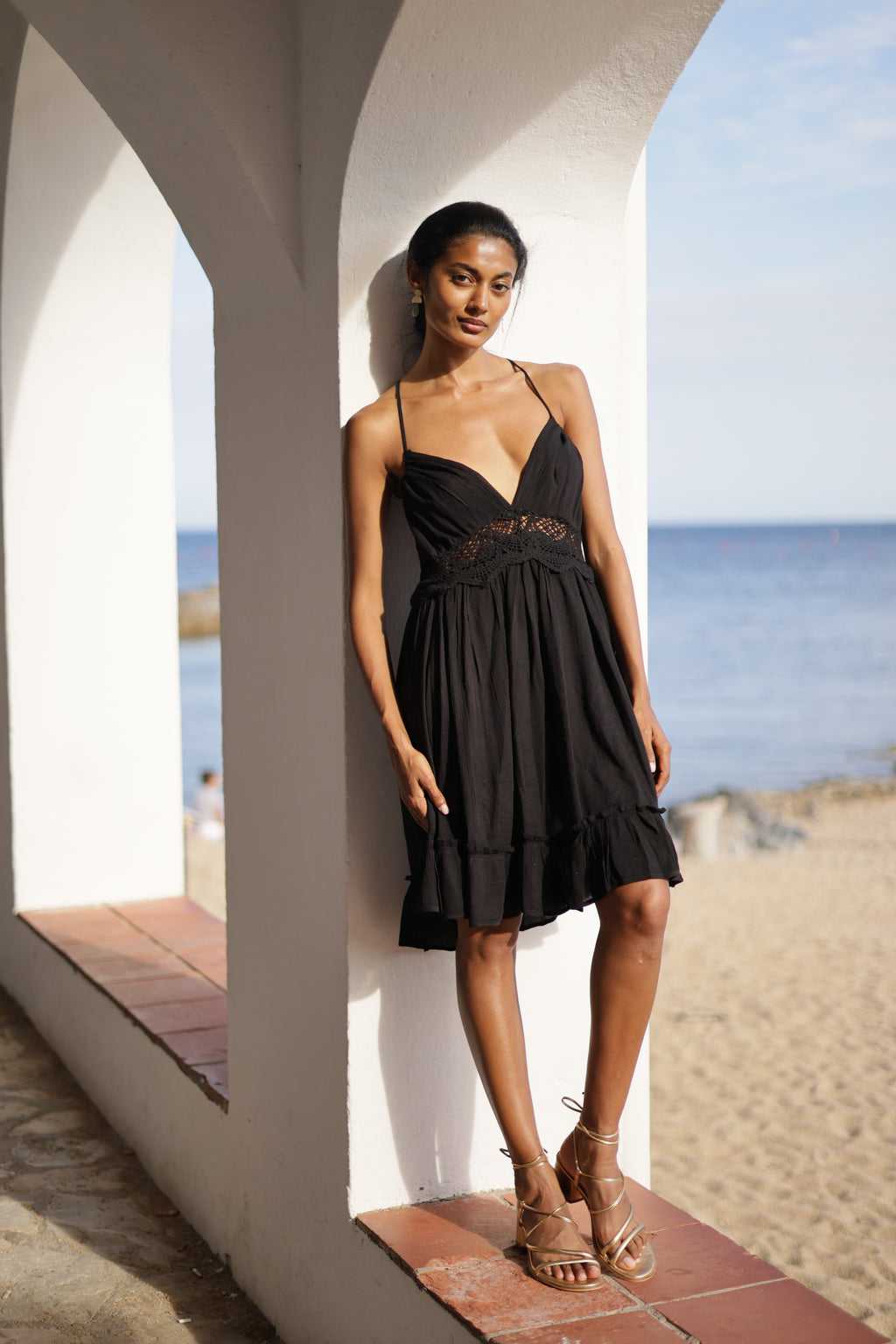The Punta Canela dress is short in cut. With thin straps. Delicate crochet lace detail on the front but it is on the back where the subtlety of this matching crochet lace stands out, giving this dress a romantic touch. Short flowing skirt, finished with a discreet flounce. This dress is a fresh and feminine garment for the hottest days of summer! You will surely look radiant in the Punto Canela dress!