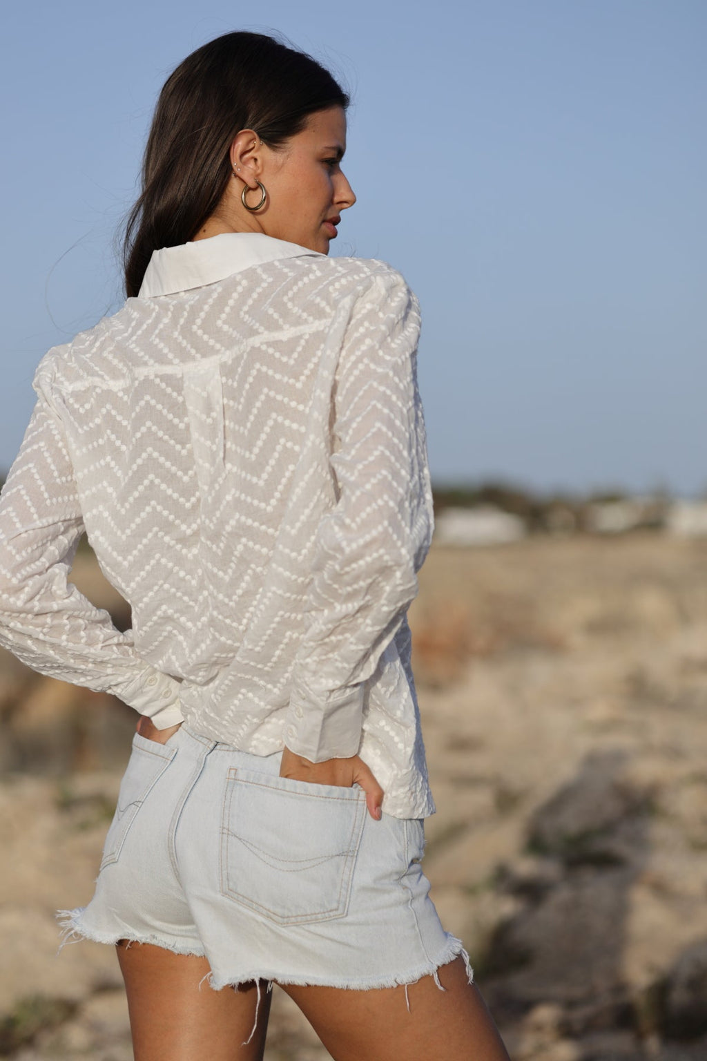 Combínala con jeans, faldas de lino o shorts de tiro alto para conseguir un look boho chic sin esfuerzo. La camisa bordada blanca es una prenda versátil que realza la naturalidad y el gusto por los detalles hechos con mimo.