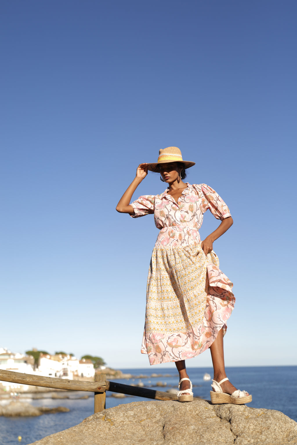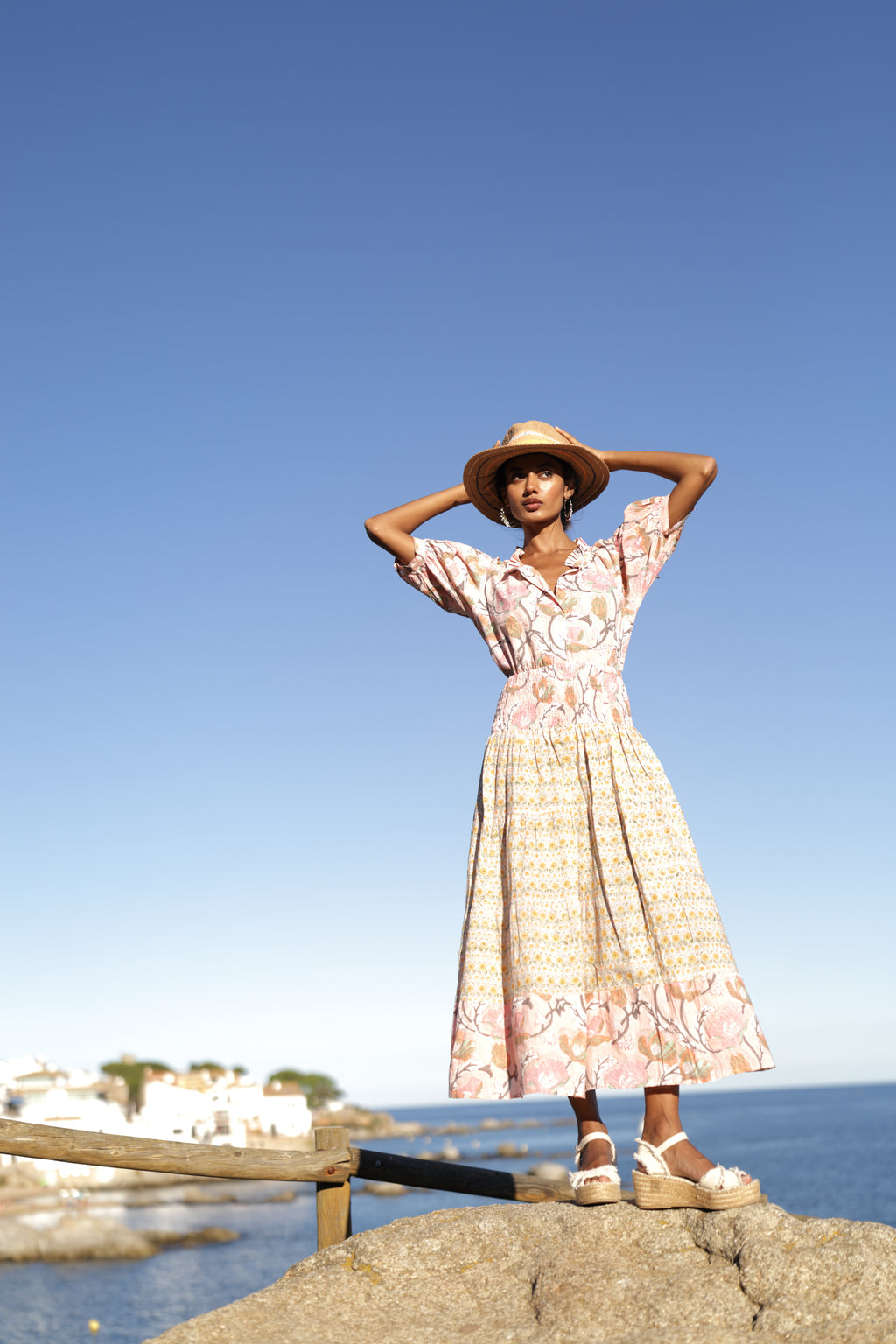Questa gonna lunga è un inno allo stile bohémien e romantico, realizzata in cotone leggero per offrire freschezza e comfort a ogni movimento. Il suo design fluido è impreziosito da una stampa rosa e gialla, che le conferisce un tocco artigianale e femminile. Con un taglio lungo e fluido, questo capo è ideale per passeggiate al mare o eventi all'aperto. Abbinala a camicette leggere o top aderenti per un look estivo ricco di fascino e personalità.