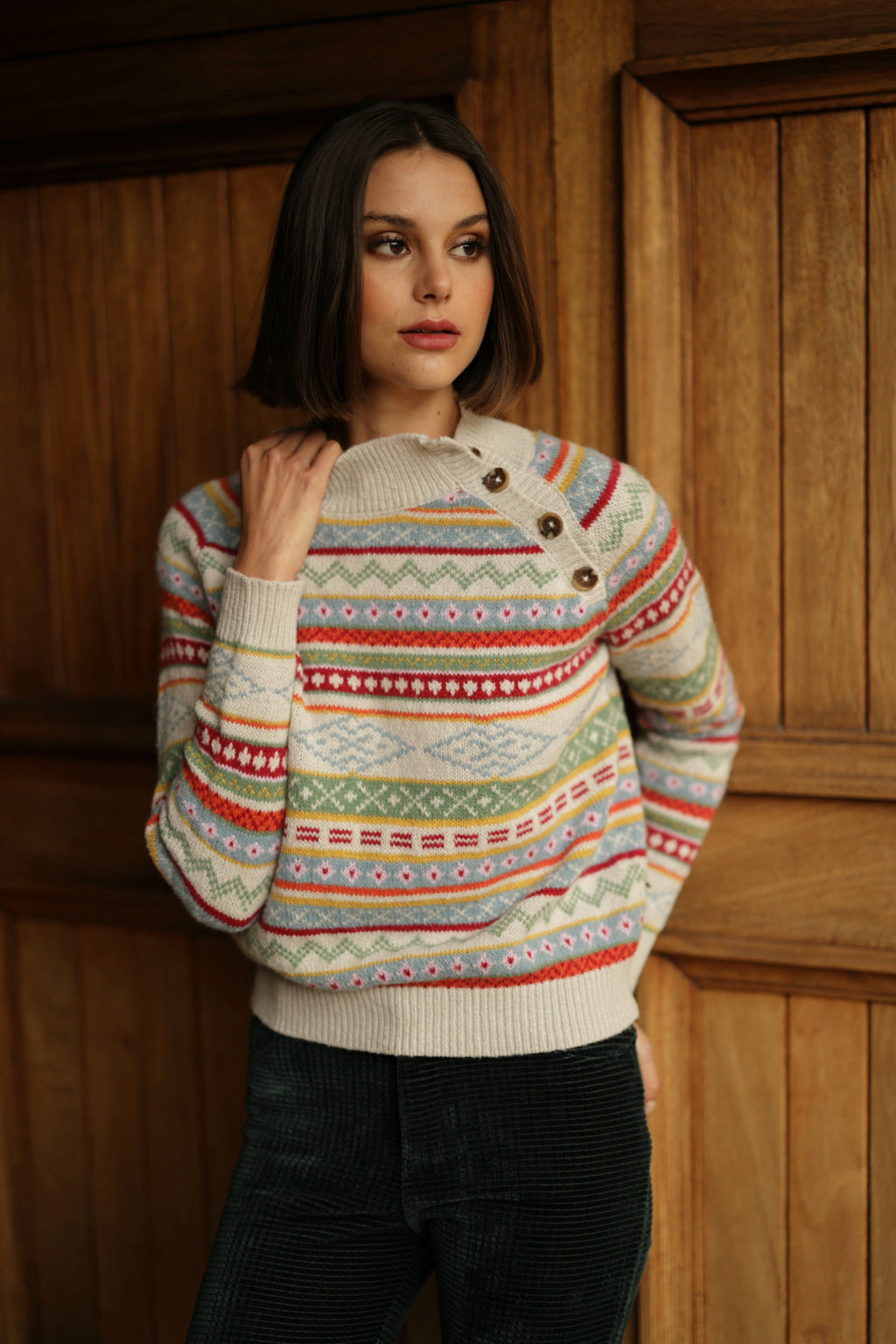 Maglia Wengen. Di ispirazione alpina. Colore naturale con design multicolore. Dettaglio del bottone laterale nella parte superiore. Manica lunga. Finiture a coste. Sta benissimo abbinato a pantaloni verdi o naturali!