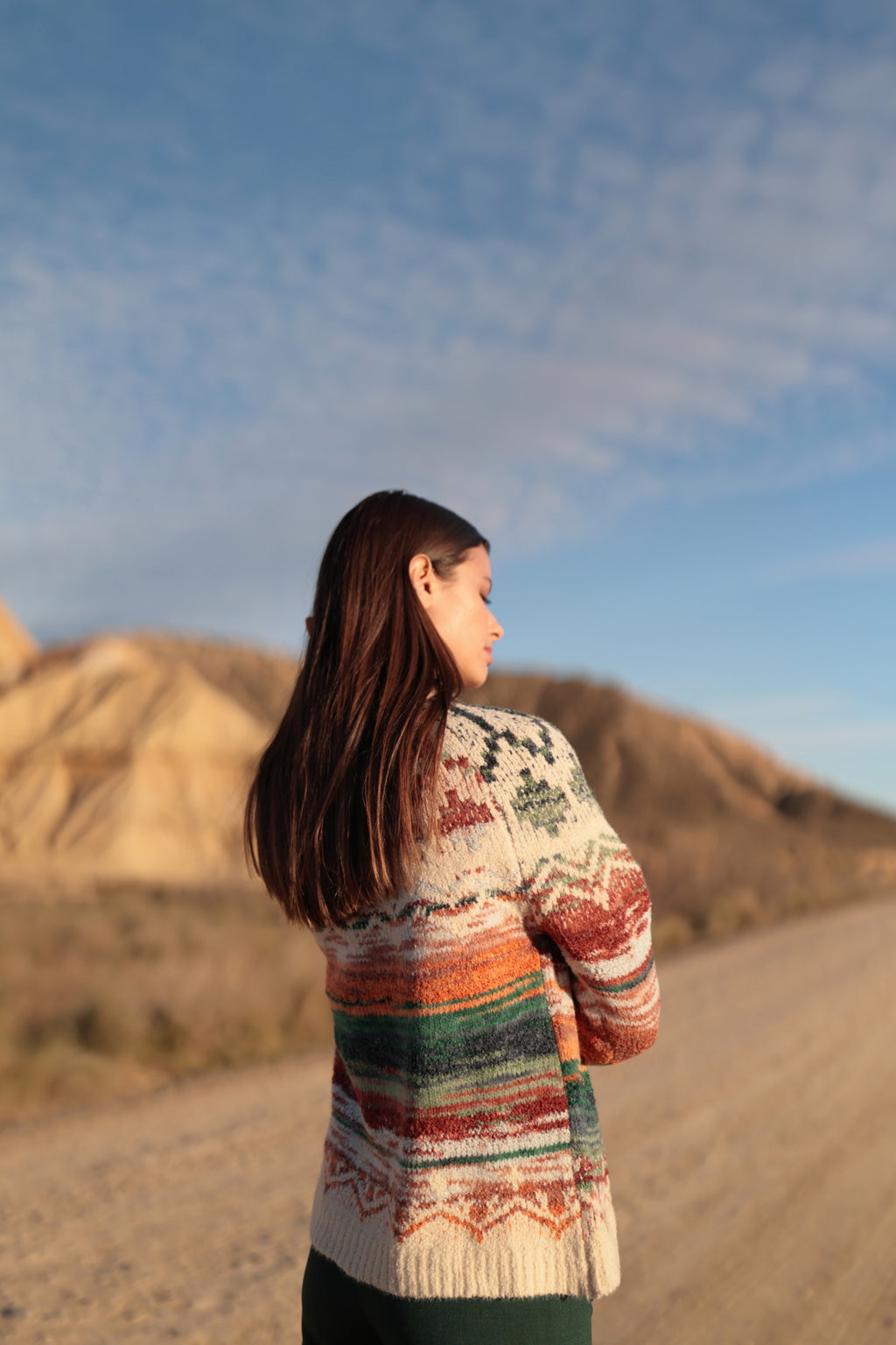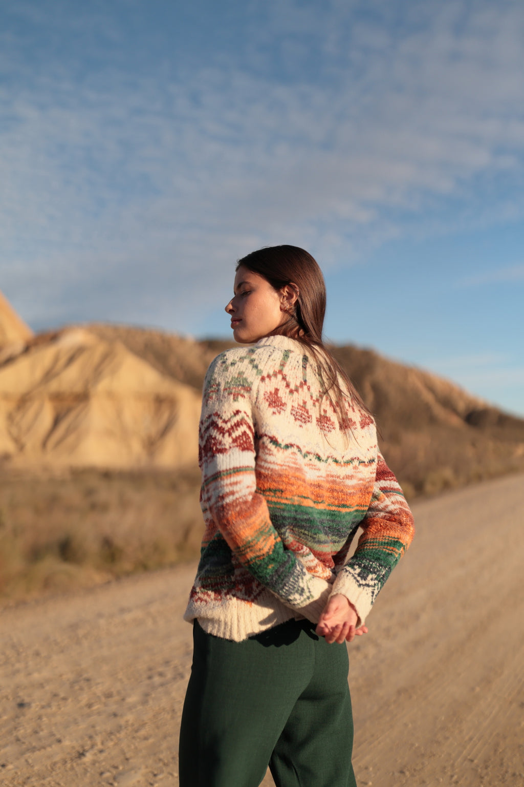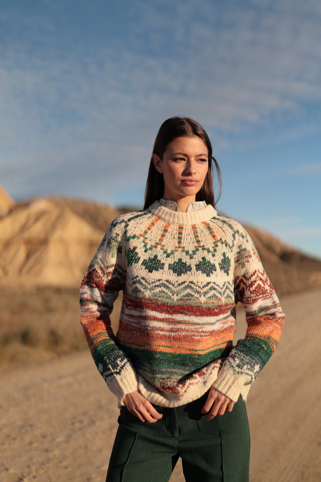 Jersey de punto combinado en tonos natural y verde. Con detalle de acabados en punto canale a contraste en color natural en cuello y puños.  Llevalo con nuestro pantalón Gadea y luciras un total look Luna Llena ideal!