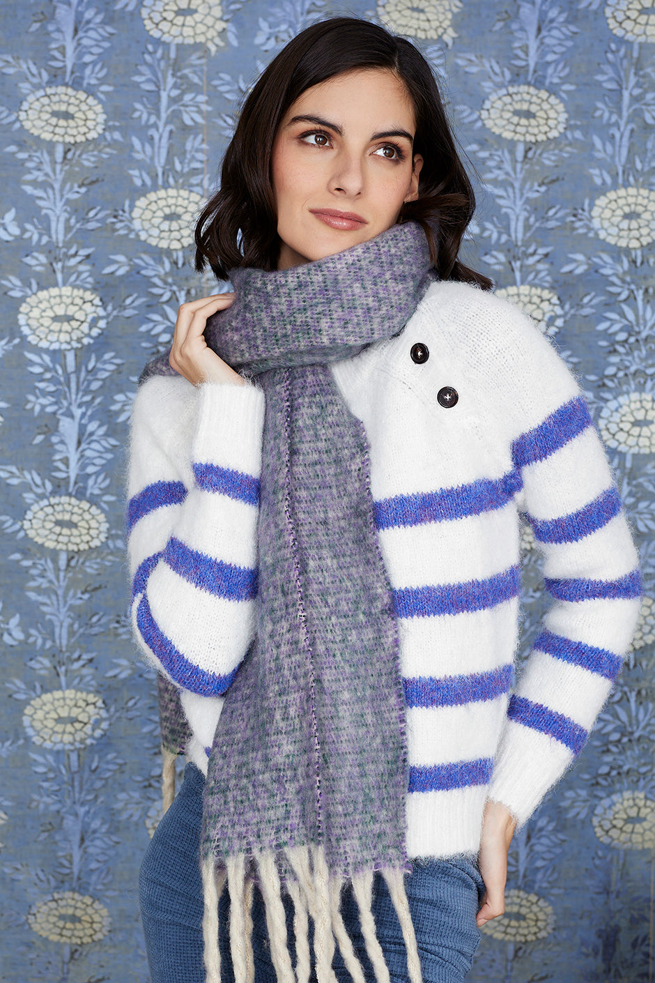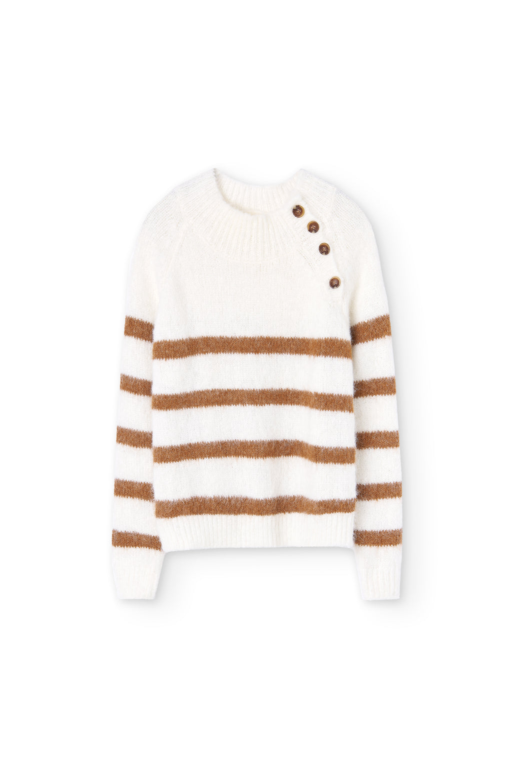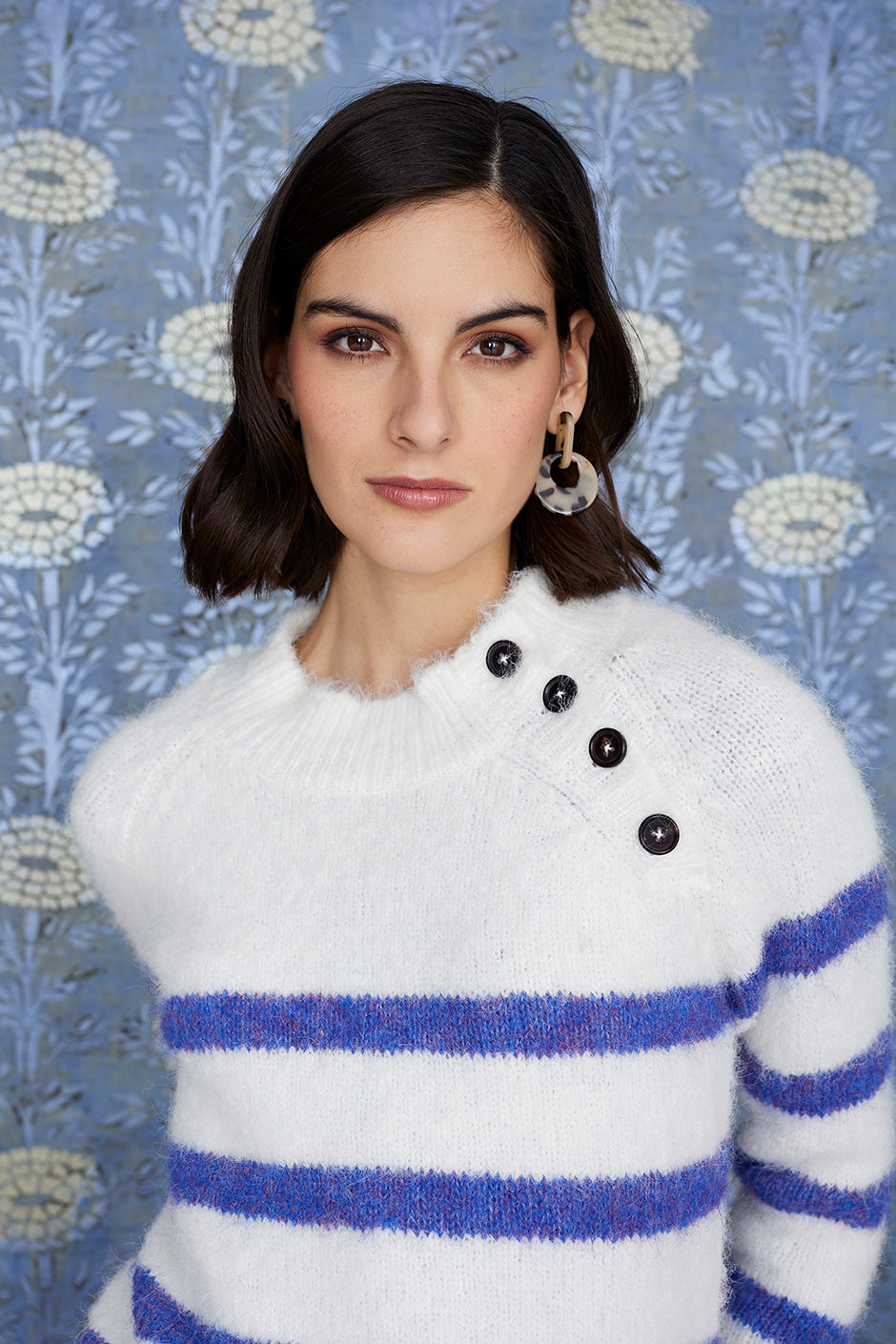 Maglia Montecarlo. In colore naturale combinato con strisce blu. Manica lunga. Spirito marinaio. Si distingue per i bottoni sul lato superiore. Ottieni un look total Full Moon abbinandolo ai pantaloni di velluto a coste e alla sciarpa blu!