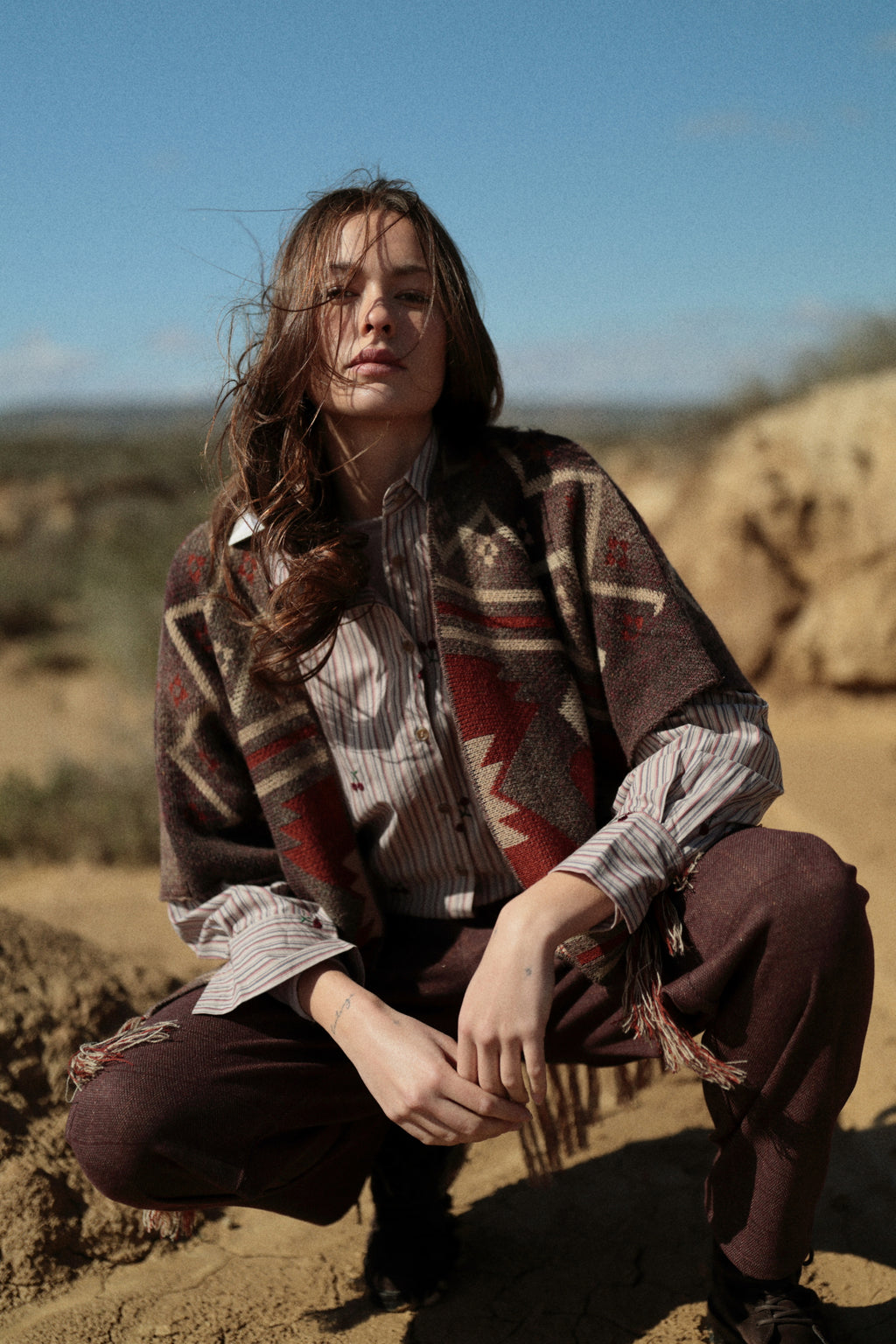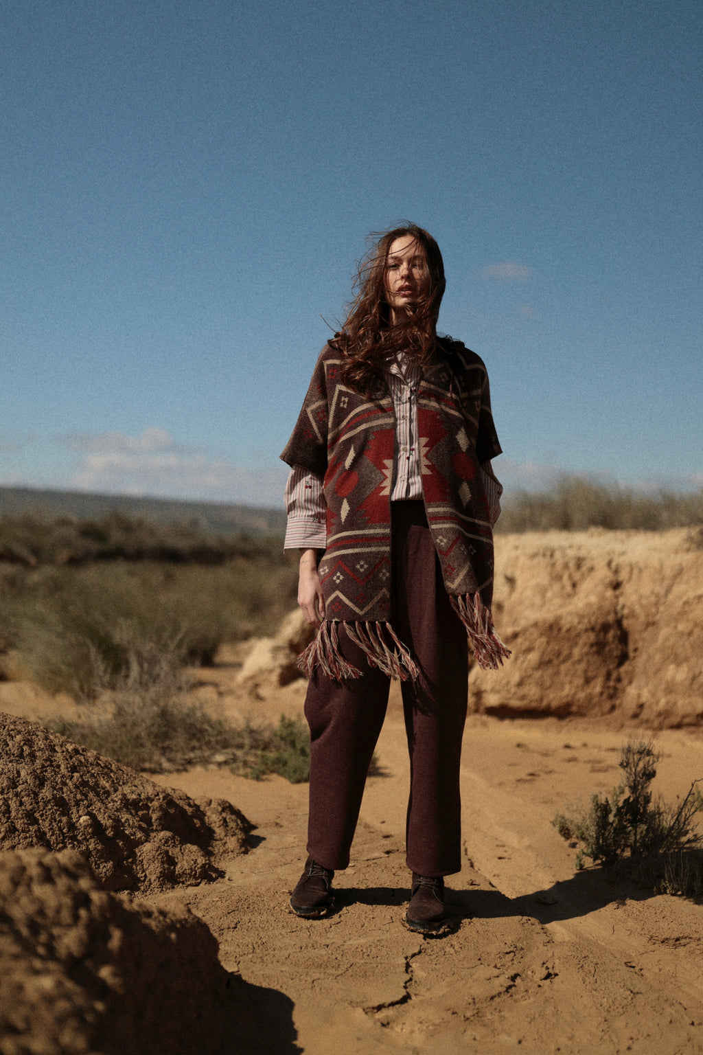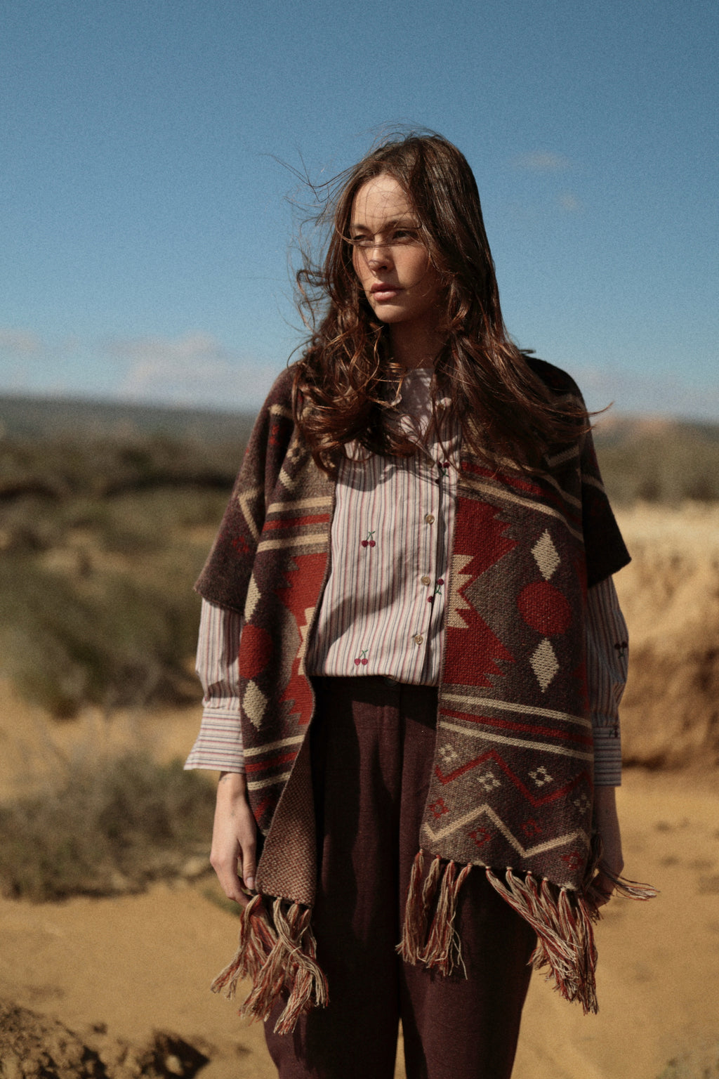 Poncho de inspitación bohemia. De caída fluida. Abierto. En tonos burdeos combinado con marrón. Con este poncho co seguirás un look boho ideal!