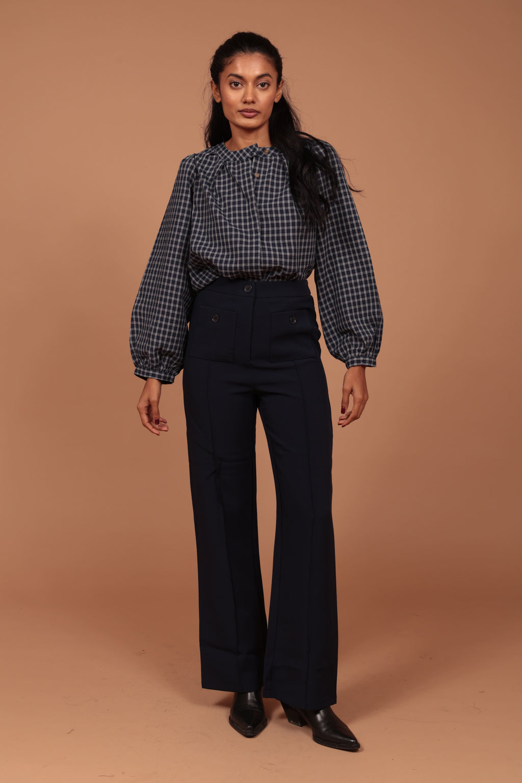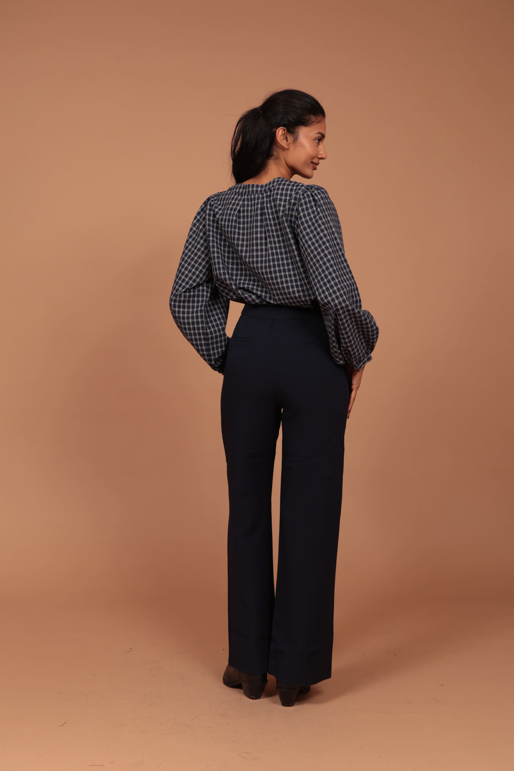 Una prenda sofisticada que combina el encanto vintage con un diseño moderno. Destaca por sus dramáticas mangas abullonadas y su cuello ligeramente fruncido. Confeccionada en un patrón de cuadros discretos en tonos marinos, ofrece un corte suelto y cómodo, ideal para el layering y elevar tus looks de oficina o casual-chic con un toque de elegancia.