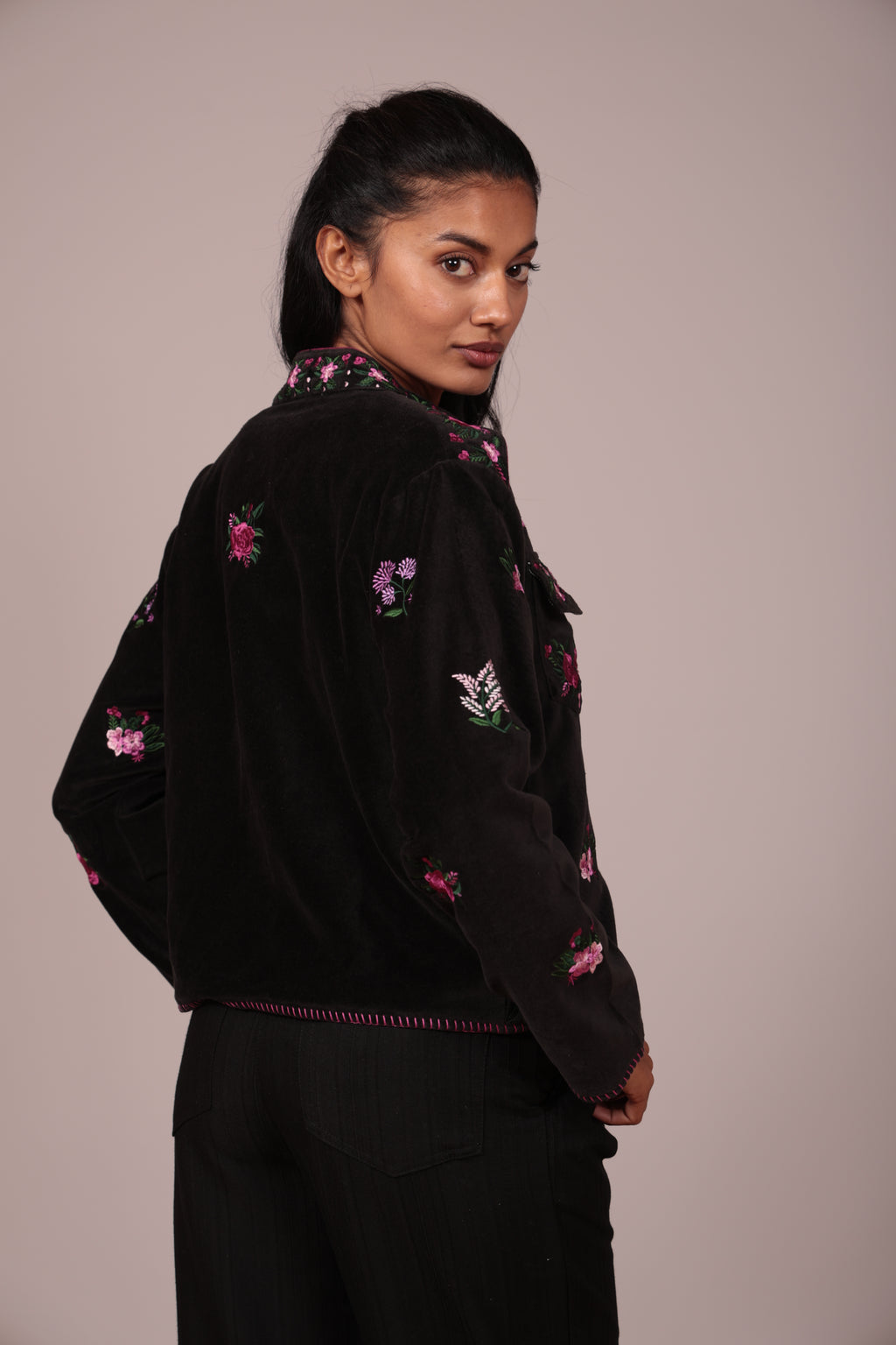 Chaqueta negra de mujer con bordados florales en tonos rosas y verdes. Diseñada en un tejido suave con acabado aterciopelado, destaca por sus detalles artesanales y su estilo elegante pero relajado. Un diseño único que aporta personalidad a cualquier outfit, ideal para looks de otoño e invierno.