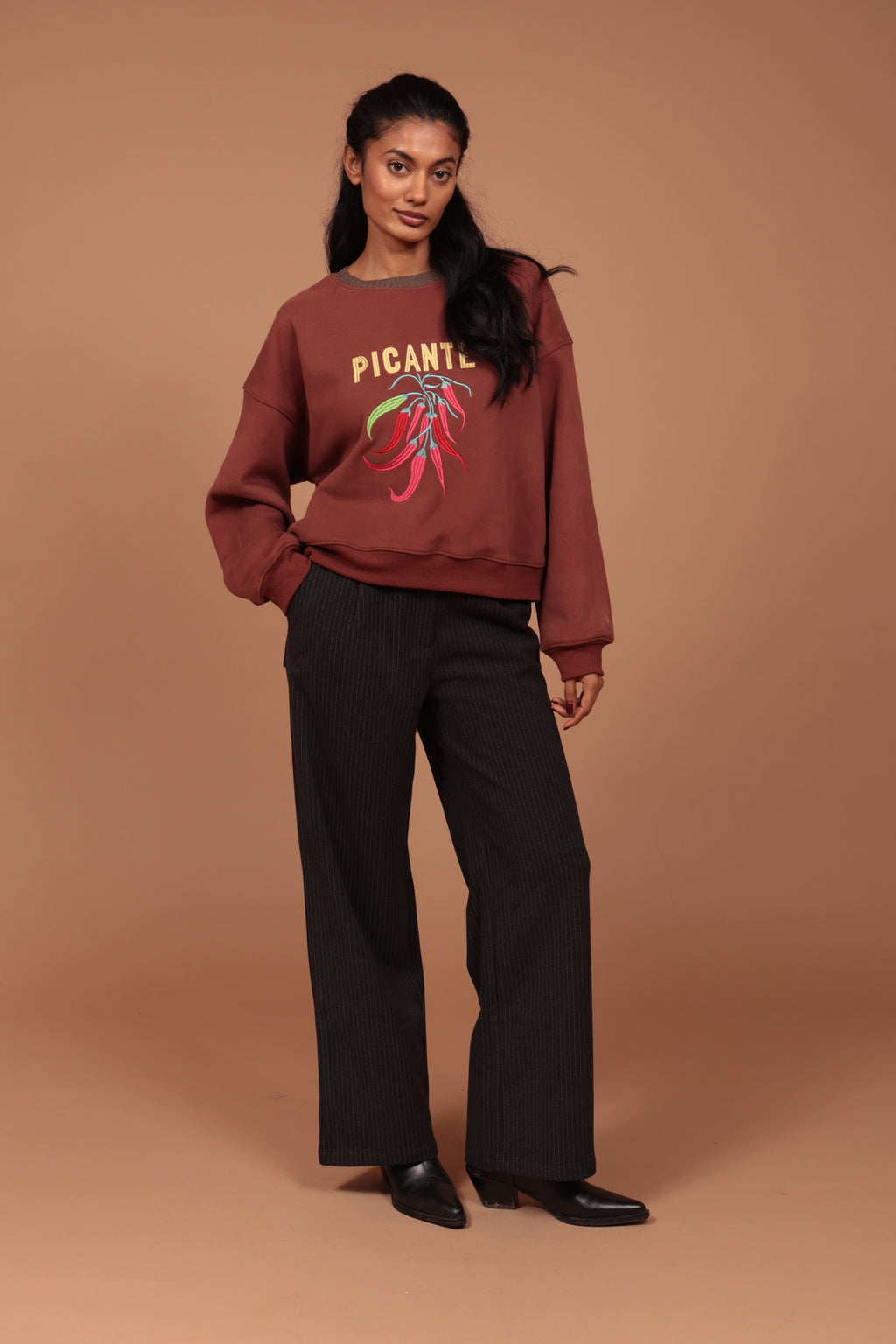 El jersey Pimientos es una prenda que combina estilo urbano con un guiño a la cultura y la fuerza de la tierra. Disponible en tonos rojo intenso y marrón cálido, este jersey destaca por su bordado de pimientos , un detalle divertido y lleno de carácter.