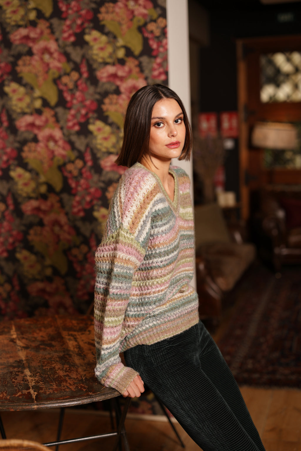El jersey Montepulciano es de un tejido muy suave y acogedor. Su tejido con hilos entrelazados en colores rosa,  natural y verde le dan un toque romántico y femenino. Favorecedor escote en V con ribete en tono verde. Manga larga. Holgado. Sin ajustar. El jersey Montepulciano es muy versátil .  Combinado con el traje chaqueta de nuestra colección Piamonte te dará un toque más formal. Mientras que combinado sólo con el pantalón Torino conseguirás un look ideal y relajado para tus dias en el campo!