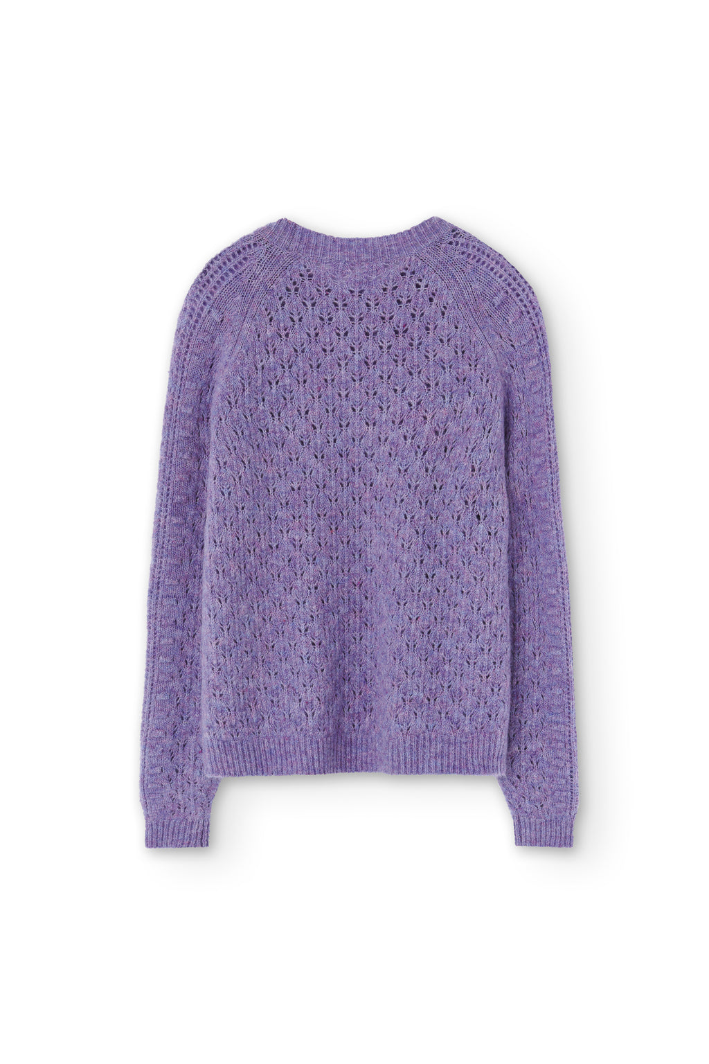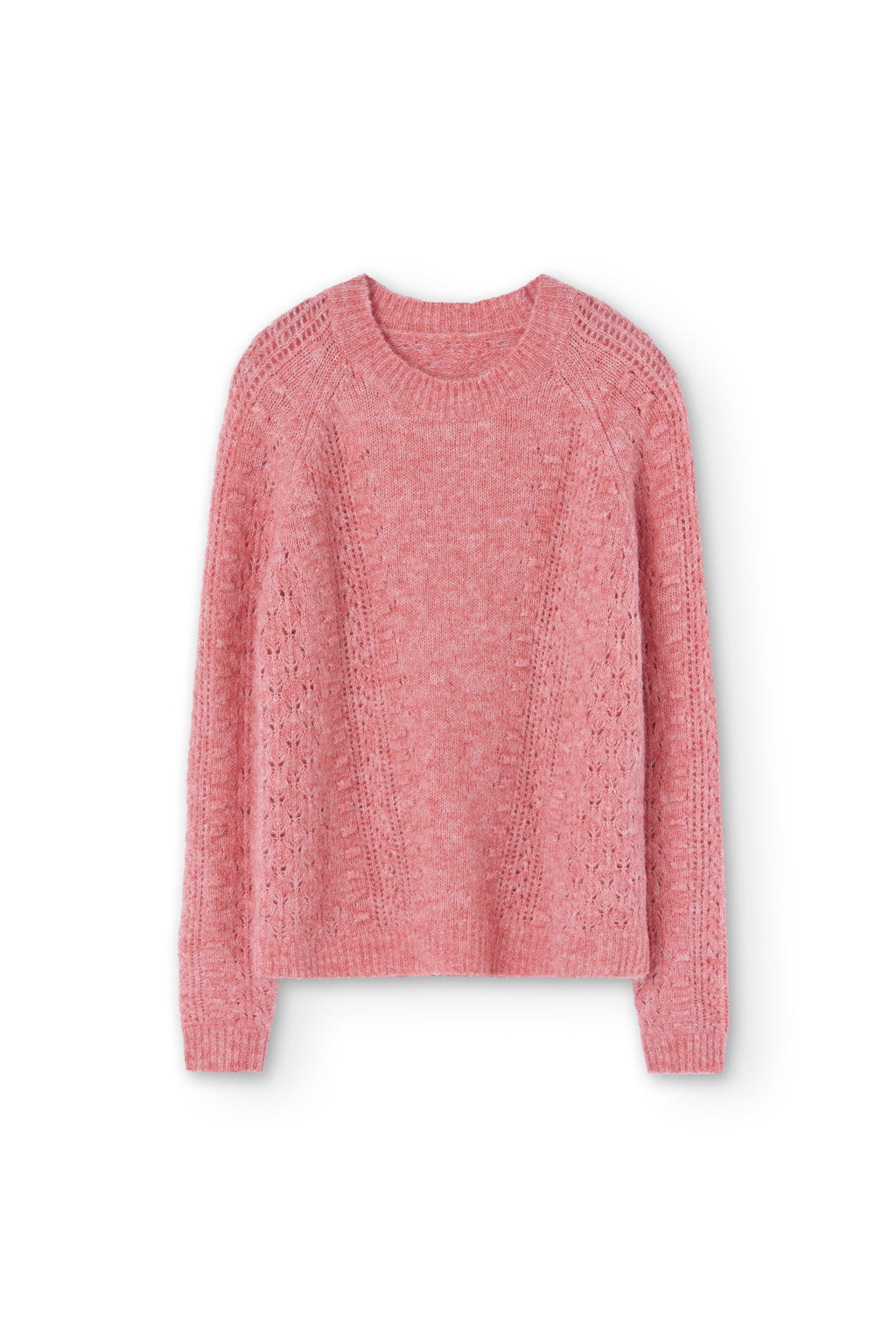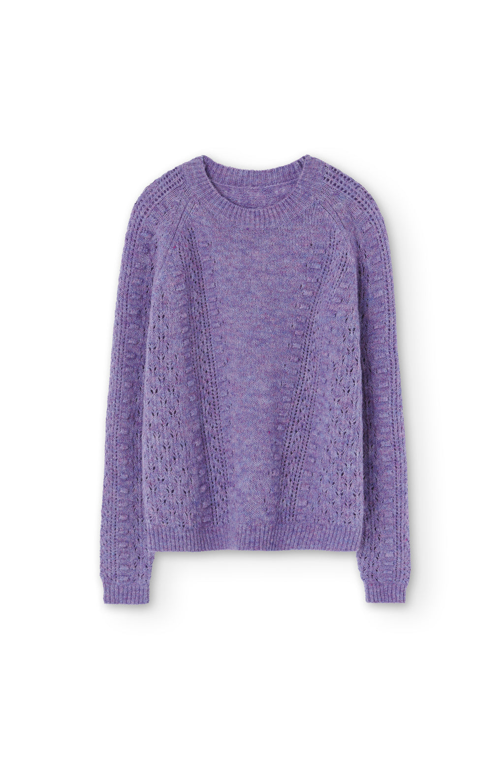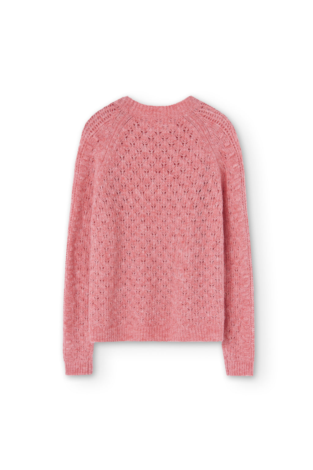 Jersey Dolly JE39. Manga larga, cuello bote, con detalles calados. Color sólido, disponible en tonos coral y lila. De corte clásico, ideal para aportar sofisticación y color a tu look.