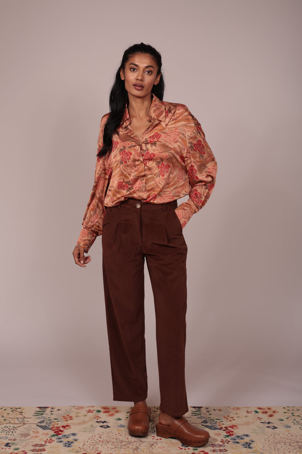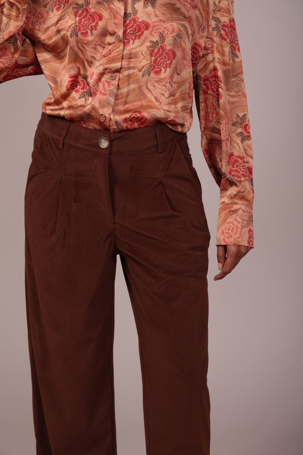 Pantalón retro en marrón chocolate. Diseño de tiro alto y corte holgado. El equilibrio perfecto entre estilo vintage y comodidad inigualable.