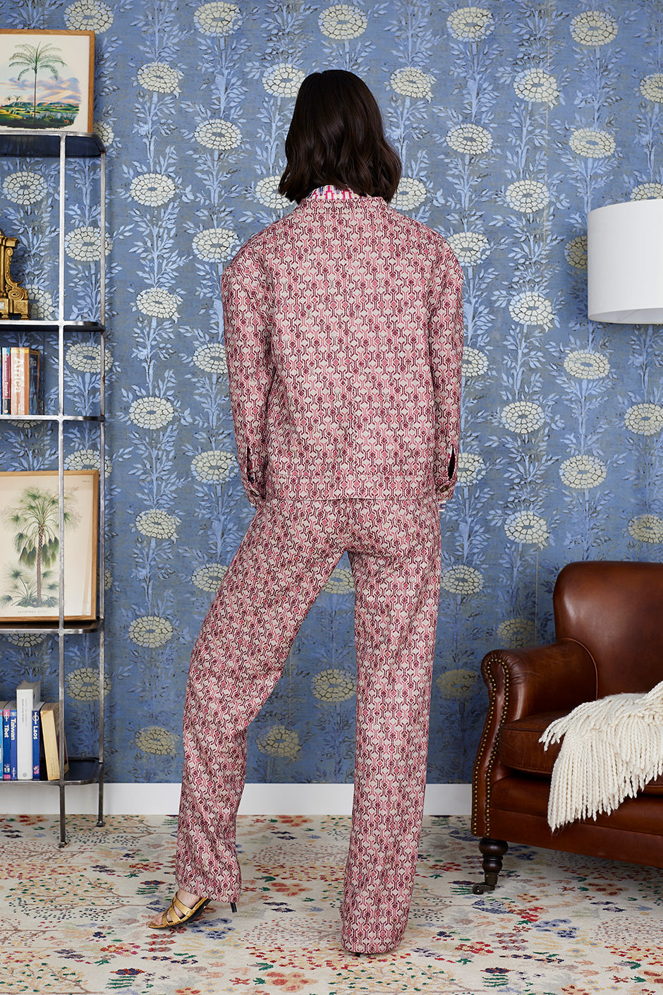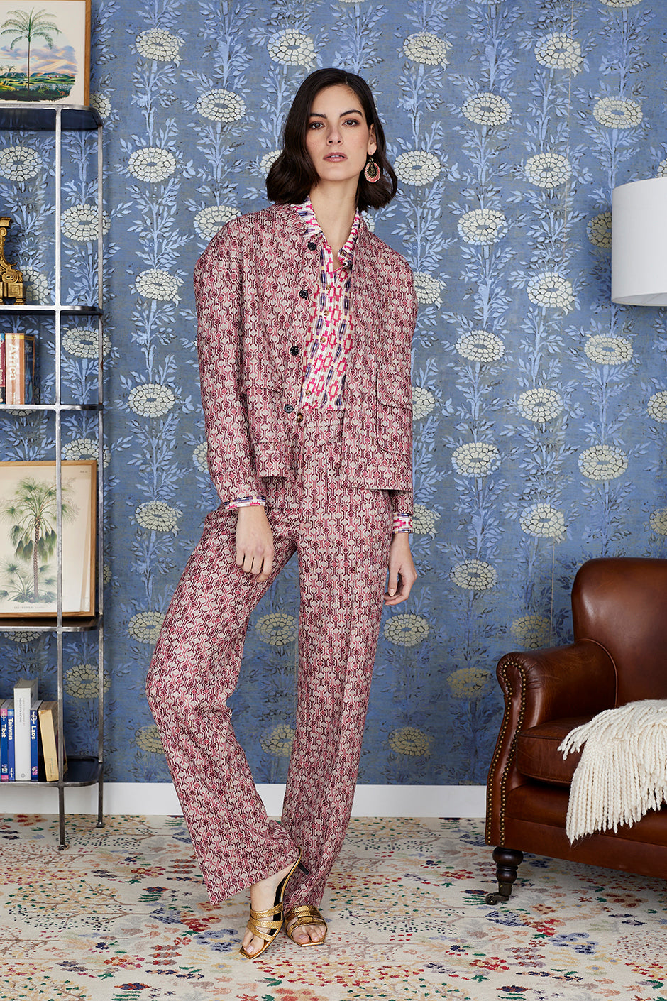 Pantalón Noemi . Estampado geometrico en tono frambuesa combinado con tono natural y dorado. Pernera ancha. Cierre con botón y cremallera. Con dos bolsillos en la.parte de delante.  Lleva tu talla habitual.  Combinalo con la chaqueta Nerea!
