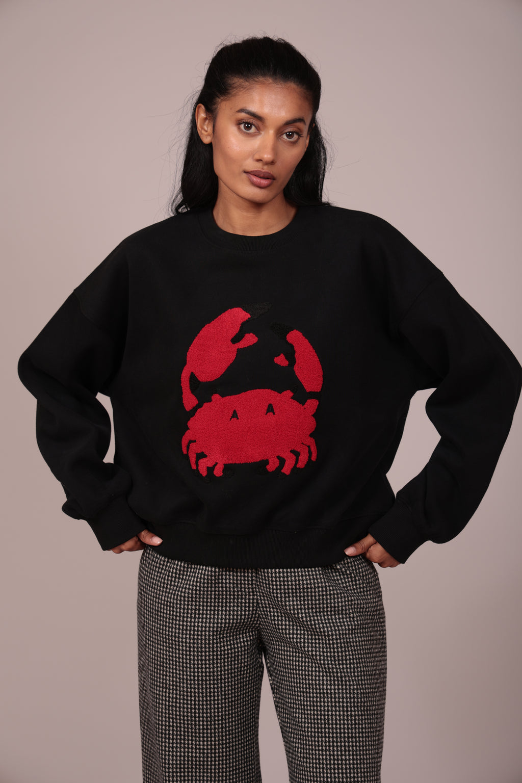 Eleva tu street style con esta sudadera negra oversize de cangrejo. Tejido suave y cálido ideal para invierno.