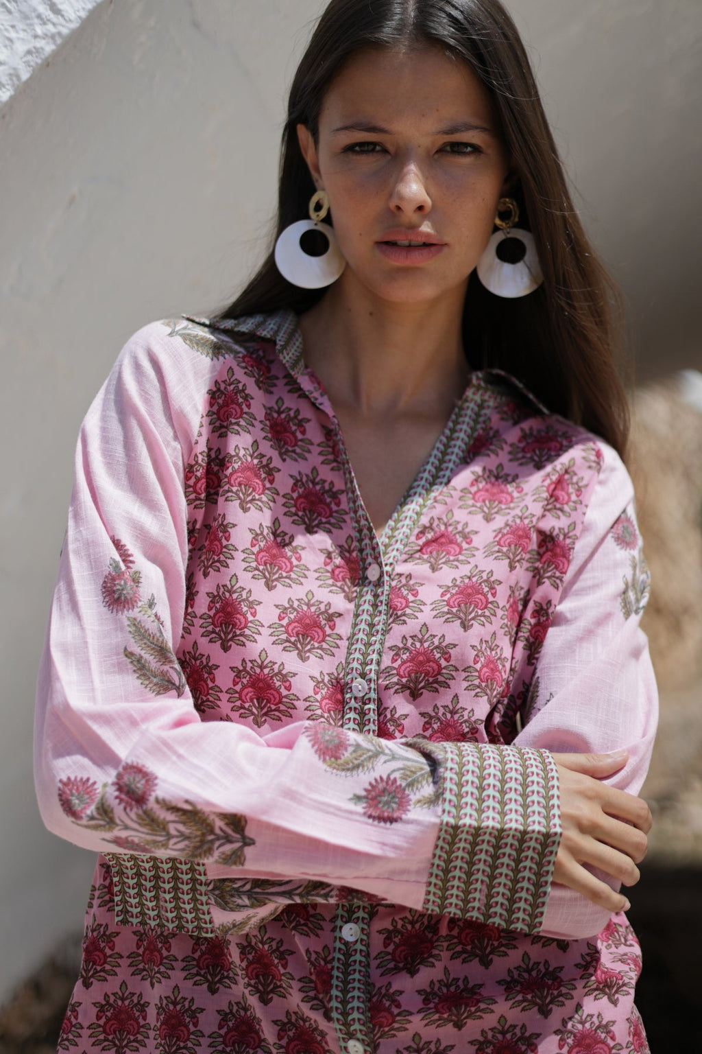 El vestido Macarena es de estilo boho chic.. Tiene un delicado estampado en tonos rosa. Corte midi. Su diseño camisero con cuello clásico y mangas largas aporta un toque sofisticado, mientras que la apertura frontal con botones y su caida fluida realzan tu silueta con movimiento y frescura. Confeccionado en algodón, es ideal para lucir elegante, femenina  y con un aire bohemio!