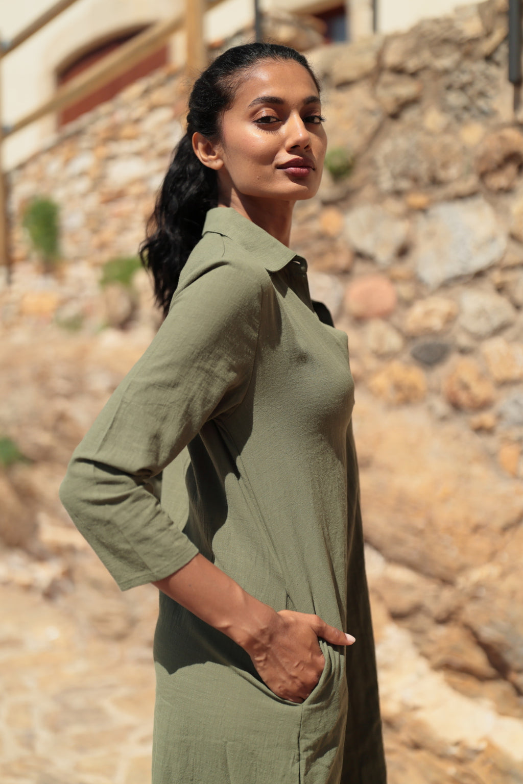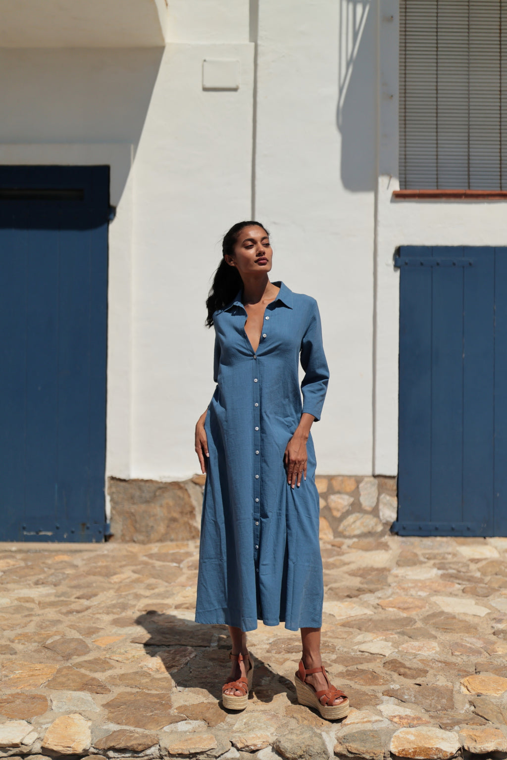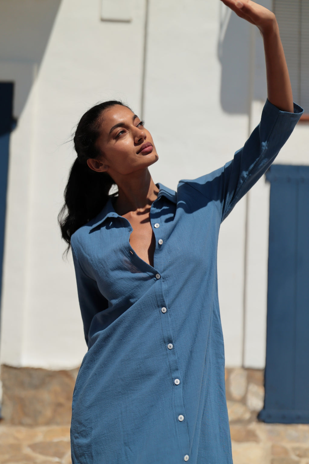 Vestido camisero Miami inspirado en la esencia mediterránea en tonos lisos. Disponible en tono celeste, coral y kaki. Con un corte camisero, manga 3/4 y cuello solapa. Su apertura frontal con botones lo hace versátil y cómodo. Sigue tu talla habitual. Su material natural en algodón 100% hace que esta prenda sea ligera y fresca. ¡Ideal para el verano!
