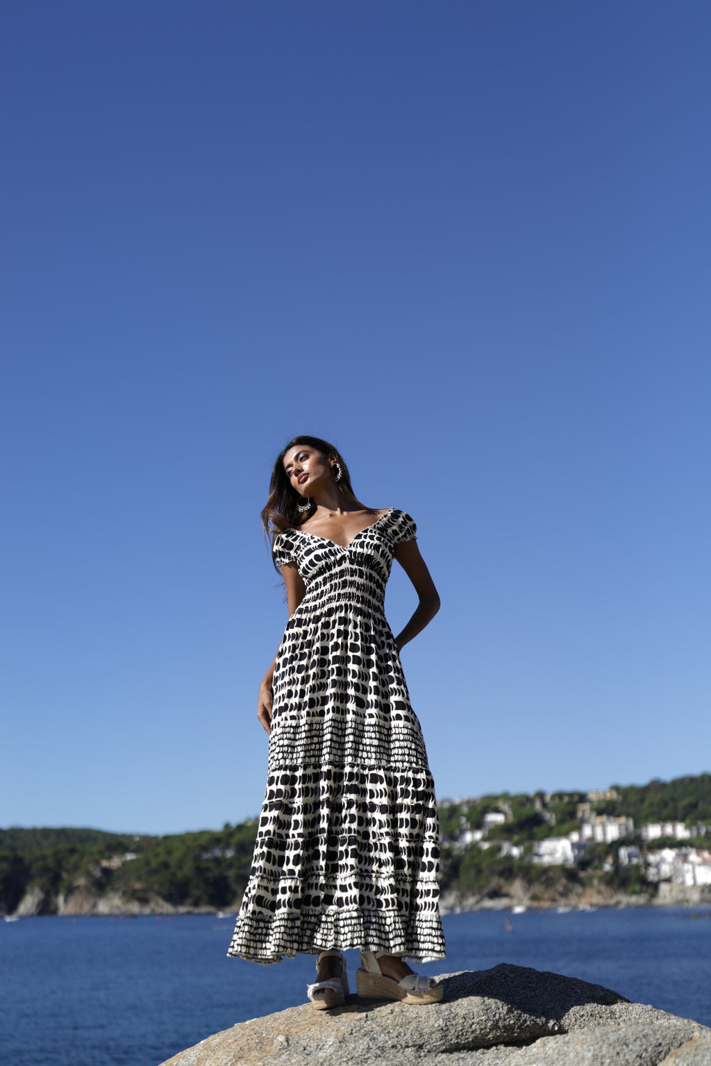 Vestido largo Frida. Estampado Hydra de lunares combinado negro y arena. Manga corta abullonada con fruncido elástico. Escote muy favorecedor en V con delicado fruncido. Escote redondo en la espalda. Falda larga fluida con volantes. Cintura elástica elástica que se ajusta perfectamente a tu silueta. Sigue tu talla habitual. ¡El vestido Frida queda ideal!
