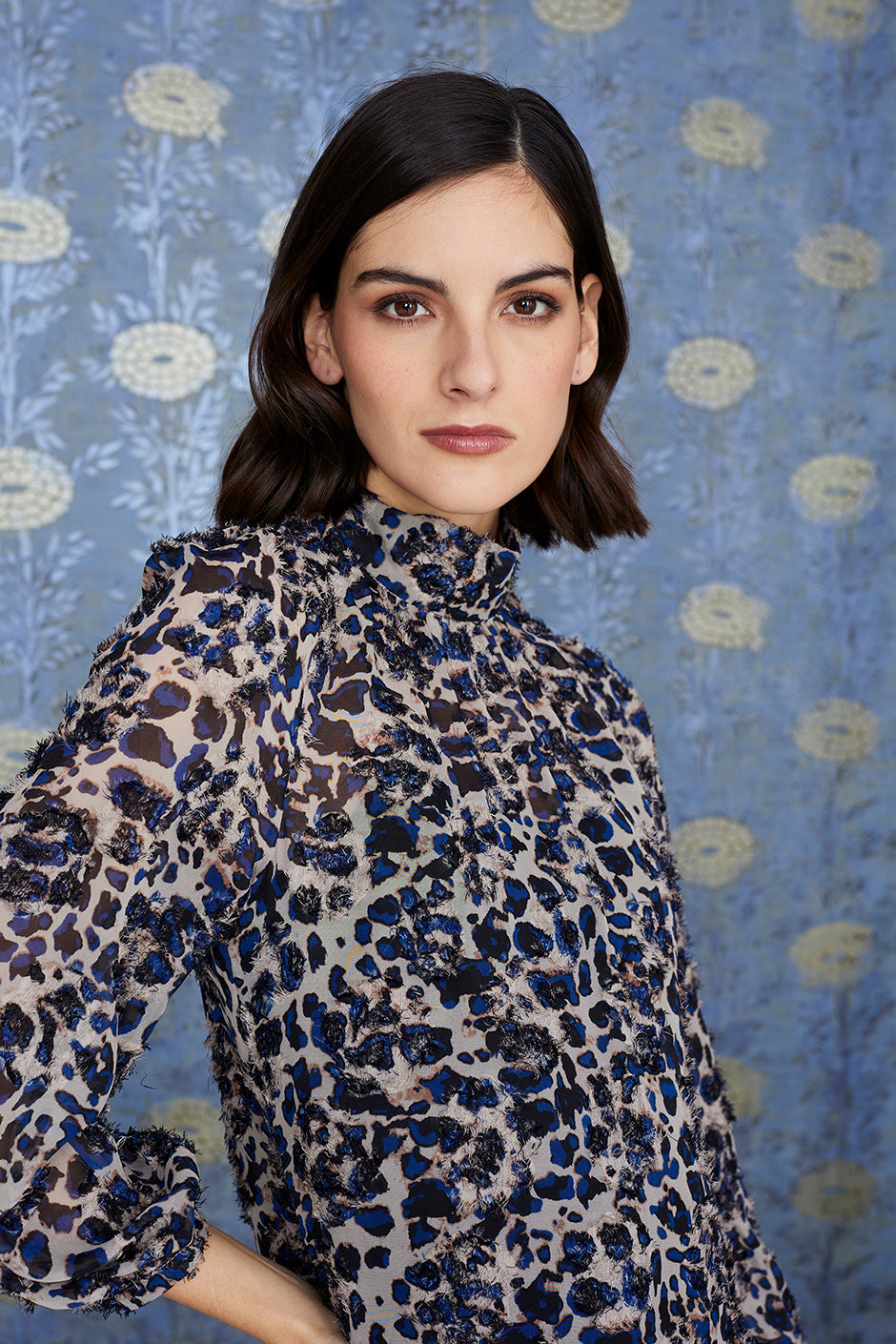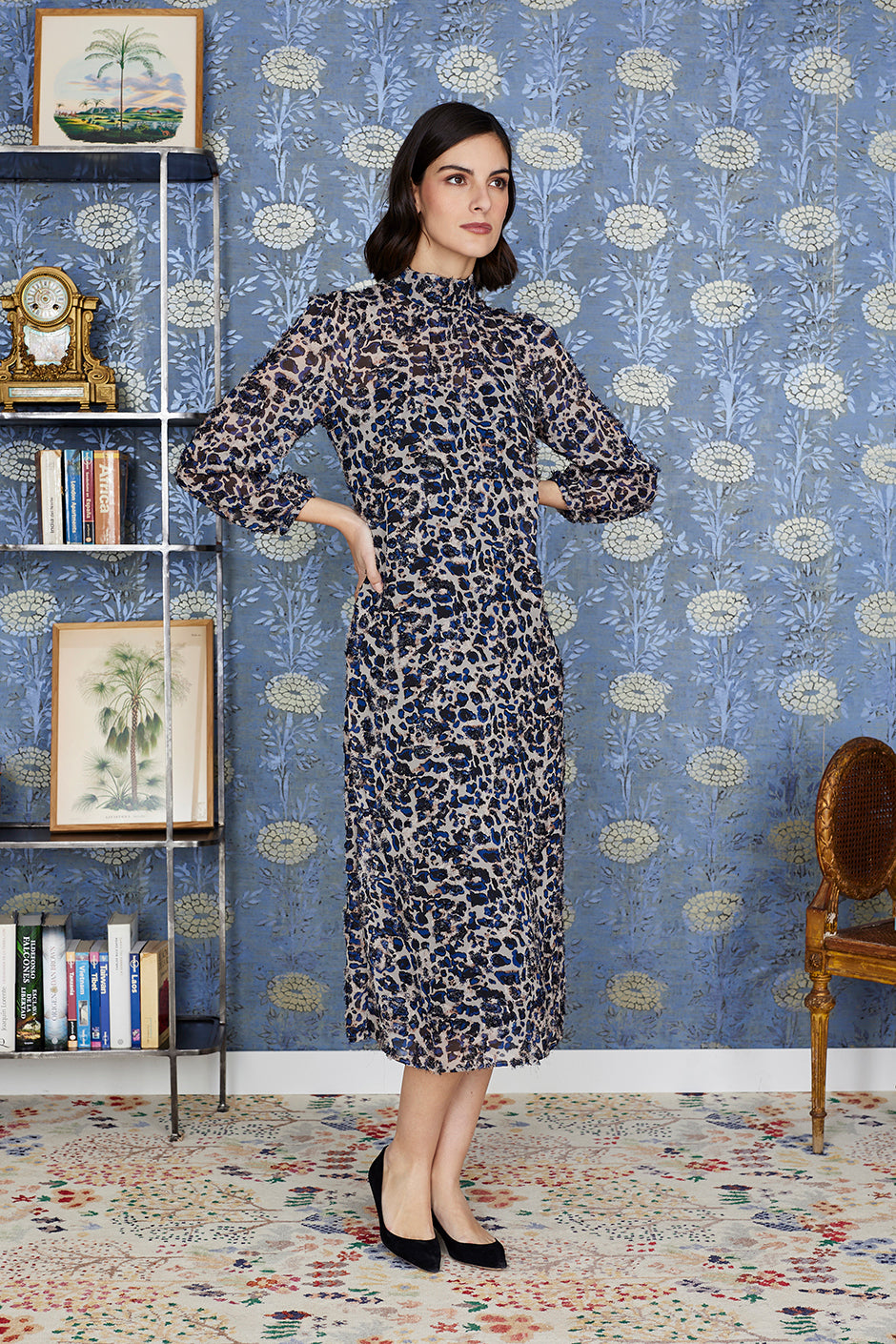 Vestido Renata estampado animal print en tonos azul. Corte midi. Manga larga. Fluido. Llévalo con el cinturón. Sigue tu talla habitual.